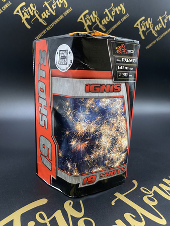 - Dynamiczna, 19-strzałowa wyrzutnia IGNIS od firmy Piromax. PXB2310 posiada ładunki o kalibrze 30mm z czerwonymi oraz zielonymi gwiazdami ze srebrnymi tytanowymi chrysantemami z cracklingową miną.