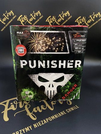 - Potężna wyrzutnia Punisher z 25 strzałami o największym dostępnym kalibrze 50mm. PXB3923 posiada bogaty wachlarz dużych kolorowych efektów. Czas działania ok. 60 sekund.